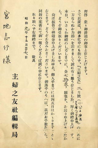 優良コドモエホンの裏表紙 “親御様方へ”という安倍季雄の添書がある。 近頃、芸術的教育や、情操教育の立場から、 一般識者の間に、絵の教育と言ふ事が やかましく論議され、留意されるやうに なつた事は、喜ぶべき事であります。 誰しも、美しい上品な絵を見て居ると、 自然心が美しく上品になつて参ります。 子供とても同じ事で、美しい絵、上品な 絵を見る事によつて、どれだけその品性が 美化されるか分りません。 それが即ち絵の教育です。 絵の力です。 決して絵そのものを教へるのでなく、 絵の力によつて子供を上品に、 美しく育てて行かうといふのが、絵の教育 の本音であります。 この『優良コドモヱホン』は、主として、 最も子供を知り、常に子供と共に生活し、 童画家として日頃私の最も尊敬して居る 宮地志行君の苦心の作になるもので、 内容といひ、色彩といひ、印刷といひ、 実に申分ない出来ばえであります。 どなたのご家庭でも、安心してお子様方に 御興へになれる優秀な絵本として、 推奨する所以であります。 優良コドモエホン(優良コドモヱホン) シリーズ ① 桃太郎(宮地志行) ② サルカニ合戦(宮地志行) ③ ヂャウチャン(長谷川露二) ④ イソップ(宮地志行) ⑤ 僕は軍人大すきよ(梁川剛一) ⑥ 青イ鳥(宮地志行) ⑦ 動物園(宮地志行) ⑧ ヨイコニナリマセウ(宮地志行) (⑥青イ鳥は欠品、 また③⑤は著者が異なる為に欠品)        以上四点は 化粧箱入りセット本として 販売されたもの。 表紙の絵は普及本と 異なるが内容は同じ 振替送金通知 主婦の友社 宮地志行宛  主婦の友2月号 小公子挿画 日本婦人の写真版 の制作お礼として73円也 昭和9年(1934)12月27日 振出通知書 主婦の友社 宮地志行宛  百円也 昭和10年(1935)4月27日 2025年現在価値20万円~50万円 |